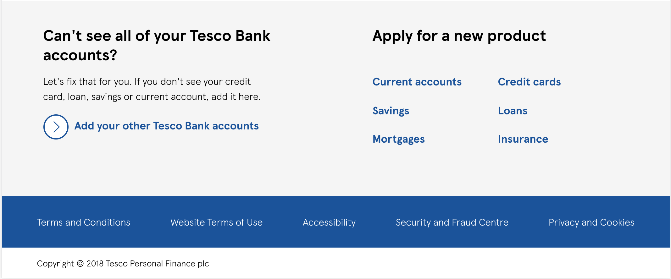 Just look for the Add your other Tesco Bank accounts button at the bottom of the page and enter the sort code and account number of your savings or loan account.