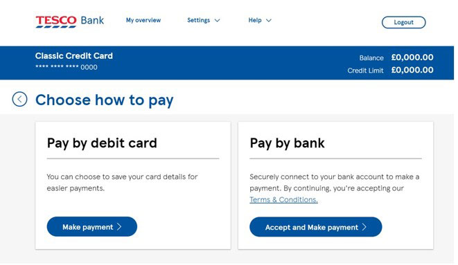 And lastly, you can send us a payment directly from your bank through the ‘Make a payment’ option and selecting ‘Pay by Bank’ where you can choose your bank from the list and make a one off payment to your bill. If you don’t see your bank on the list you can transfer money directly to us from one of your bank accounts, using your Tesco Bank 16 digit credit card number (without spaces) as the reference so we know it’s your payment.